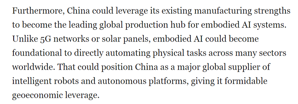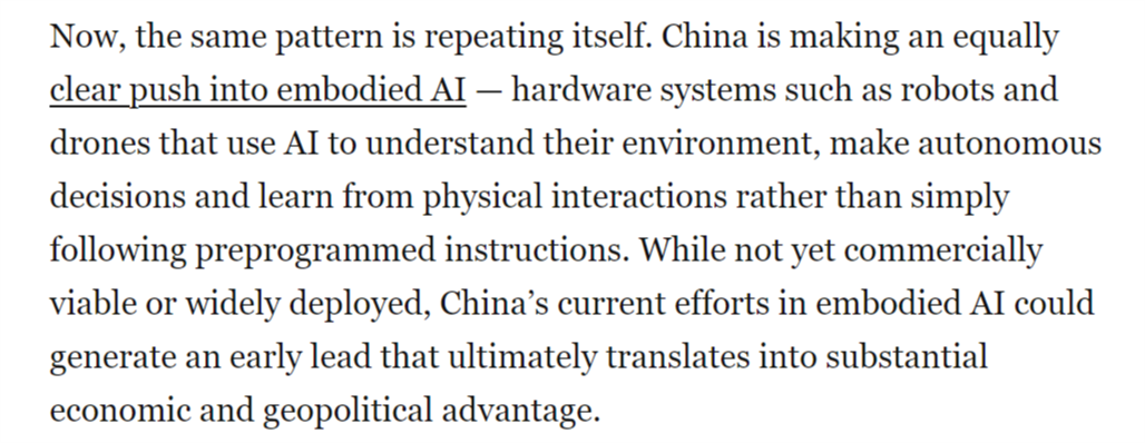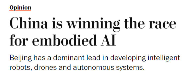 本地时间1月30日,但中国当前正在具身人工智能范畴的勤奋可能使其取得晚期领先,具身人工智能被写入中国“十五五”规划中?中国正以同样明白的力度进军具身人工智能范畴——即机械人、无人机等硬件系统操纵AI、自从决策并从物理交互中进修,