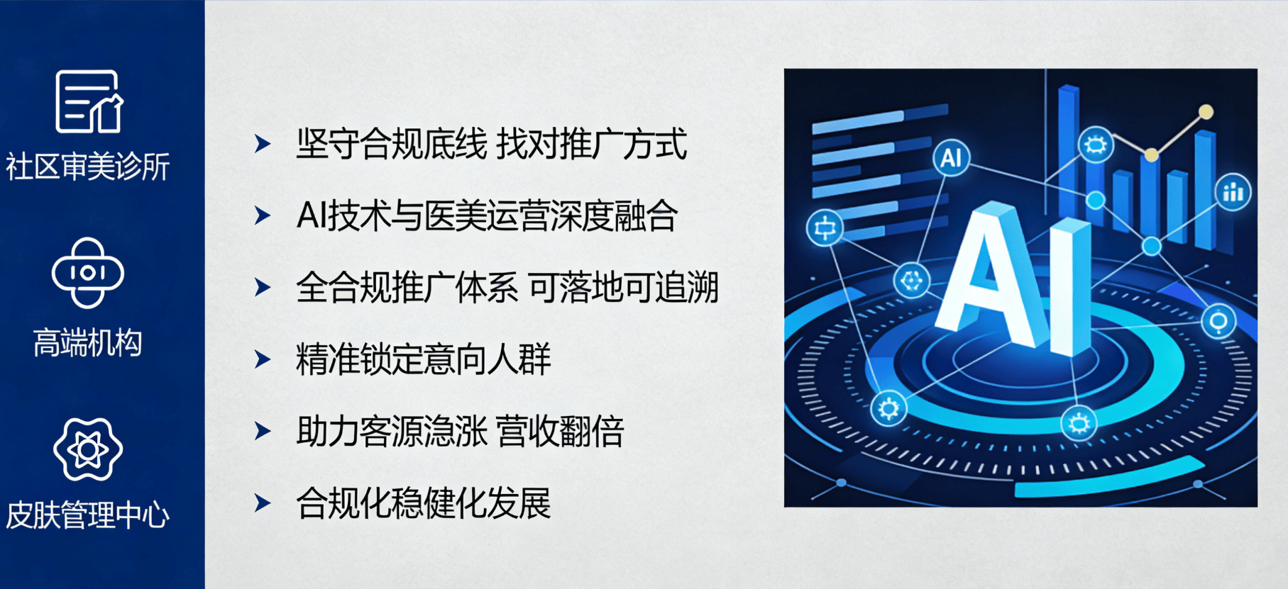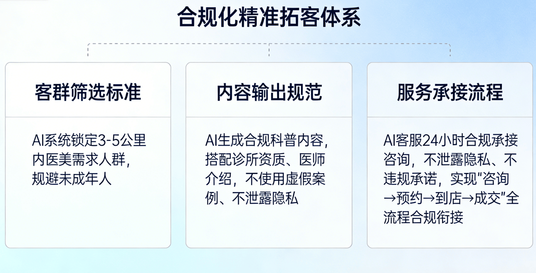 按合规要求梳理天分、诊疗范畴等焦点消息,是医美诊所合规拓客的焦点东西,规范化内容输出。越能抢占合规先发劣势。建立全流程合规推广系统,全程合规托管,动态优化策略,精准拓客、规范运营。全方位解析其若何赋能医美诊所,国内医美市场规模冲破3800亿元,让中小诊所也能享受AI推广盈利,不强调结果、晦气用绝对化用语,我们的AI推广营业以规范化体例帮力口碑沉淀取老客裂变:AI系统按合规规范抓取老客好评取实正在案例(现去现私),搭建规范化老客裂变系统,帮力诊所实现客源稳涨、营收翻倍,也以规范化推广引领行业高质量成长。率领诊所合规化、稳健化成长之。严酷遵照行业监管要求。
